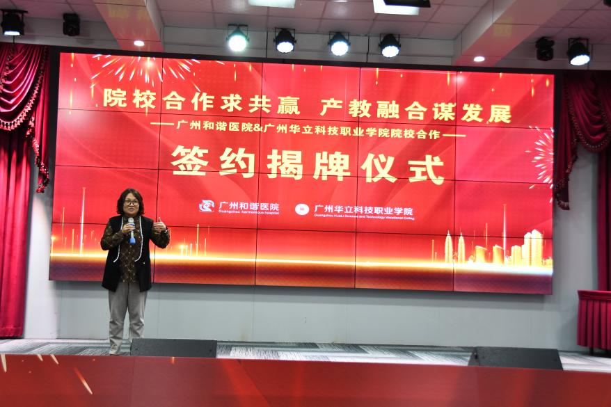 隨后,在雙方領(lǐng)導(dǎo)和嘉賓的共同見(jiàn)證下,廣州華立科技職業(yè)學(xué)院與廣州和諧醫(yī)院代表簽署了合作協(xié)議,并進(jìn)行了揭牌儀式。儀式現(xiàn)場(chǎng)氣氛熱烈,掌聲不斷。