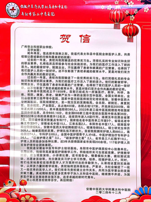 2025年1月14日,我院收到來自安徽中醫(yī)藥大學(xué)附屬太和中醫(yī)院的一封賀信。字里行間中表達(dá)了在過去的一年里,健康學(xué)院向安徽中醫(yī)藥大學(xué)附屬太和中醫(yī)院輸送了大量優(yōu)秀實習(xí)生,不僅為安徽中醫(yī)藥大學(xué)附屬太和中醫(yī)院的醫(yī)療工作注入了活力,也贏得了患者和家屬的廣泛贊譽(yù)。