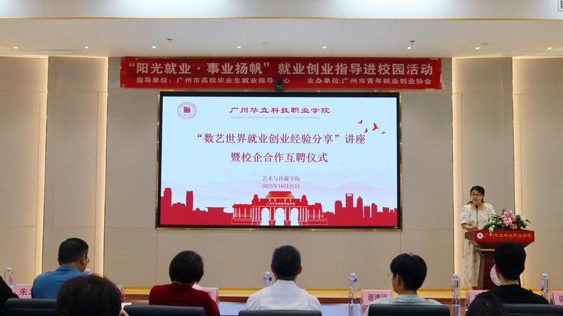 為深化產教融合,拓寬學生就業(yè)創(chuàng)業(yè)視野,2025年10月21日下午,廣州華立科技職業(yè)學院藝術與傳媒學院與廣州冠岳網絡科技有限公司在校圖書館104隆重舉行了“數(shù)藝世界”校企合作簽約牌互聘儀式暨就業(yè)創(chuàng)業(yè)經驗分享會。本次活動得到了校企雙方的高度重視。學校副校長陳顯強、教務處處長孫麗英、實踐教學科科長韋建林,藝術與傳媒學院院長朱君、黨總支書記陳改梅等領導老師出席活動。廣州冠岳網絡科技有限公司謝增福經理、黃龍城項目總監(jiān)作為企業(yè)方代表參會。