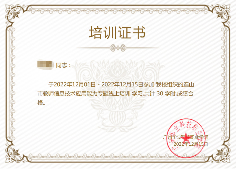 培訓(xùn)結(jié)束后,參培教師都高質(zhì)量的完成了30學(xué)時(shí)的學(xué)習(xí)任務(wù),我校為參訓(xùn)學(xué)員頒發(fā)了培訓(xùn)證書。今后,我校繼續(xù)加強(qiáng)與連山壯族瑤族自治縣教育部門的聯(lián)系,落實(shí)對口幫扶各項(xiàng)任務(wù),幫助對口幫扶單位切實(shí)提高基礎(chǔ)教育教師教學(xué)能力!