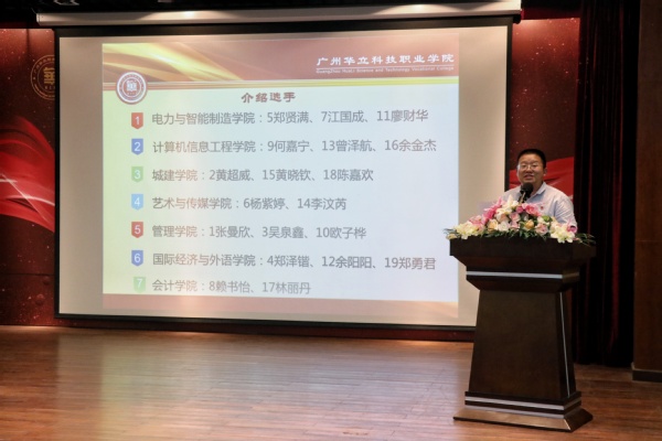 出席本次競選大會(huì)的評委老師有:廣州華立科技職業(yè)學(xué)院高堯來副校長、學(xué)生處處長曾祥彪老師、團(tuán)委書記朱君老師、教務(wù)科科長王澤秀老師、生活指導(dǎo)科副科長謝菲老師。