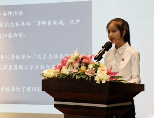接著選手們用PPT上臺(tái)演講,從品德、學(xué)業(yè)、社會(huì)實(shí)踐、個(gè)人突出表現(xiàn)等方面介紹個(gè)人成績,并由評委老師們提問的方式進(jìn)行評選。經(jīng)過選手們激烈的競爭,競選進(jìn)入評選階段。