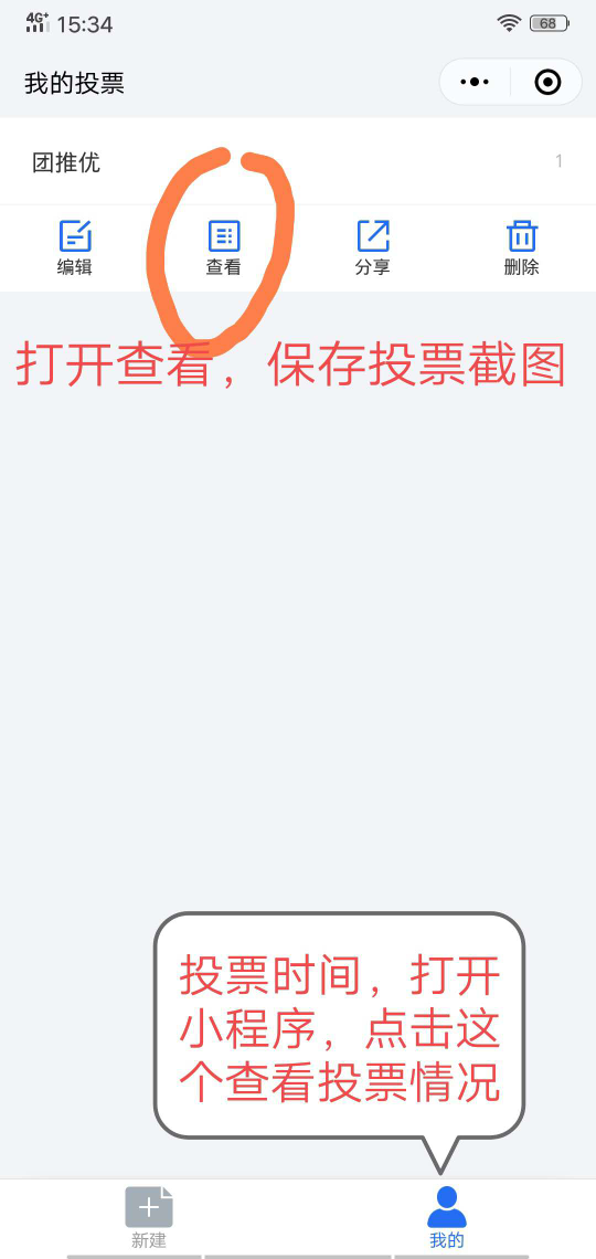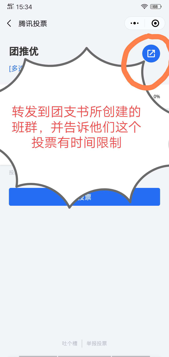(3)與會(huì)團(tuán)員對(duì)符合“團(tuán)推優(yōu)”條件的團(tuán)員進(jìn)行線上民主評(píng)議并用微信小程序騰訊投票進(jìn)行投票并且由投票發(fā)起人截圖唱票;(詳細(xì)投票過程請(qǐng)根據(jù)附件四進(jìn)行)