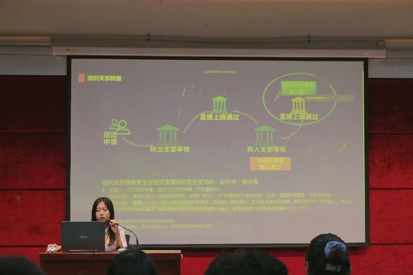 隨后,由團(tuán)委辦公室張家燕同學(xué)為20級的新生團(tuán)支書們作智慧團(tuán)建的介紹,詳細(xì)講解了轉(zhuǎn)入轉(zhuǎn)出的相關(guān)事項(xiàng),并且解答在場團(tuán)支書的疑問。