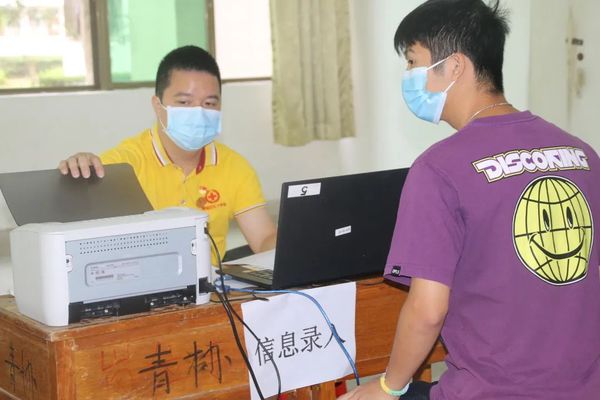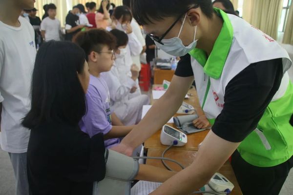 工作人員給獻(xiàn)血的同學(xué)們驗(yàn)血型并錄入個(gè)人信息