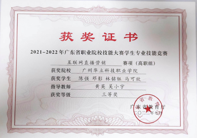 學(xué)生參加2021-2022年省職業(yè)技能競賽互聯(lián)網(wǎng)直播營銷賽項獲得三等獎