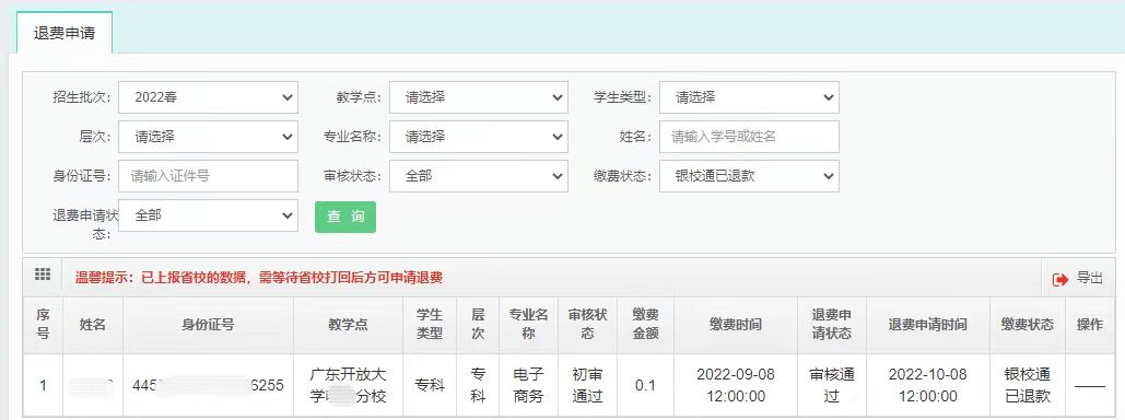 操作路徑:新生退費(fèi)管理>>退費(fèi)申請。