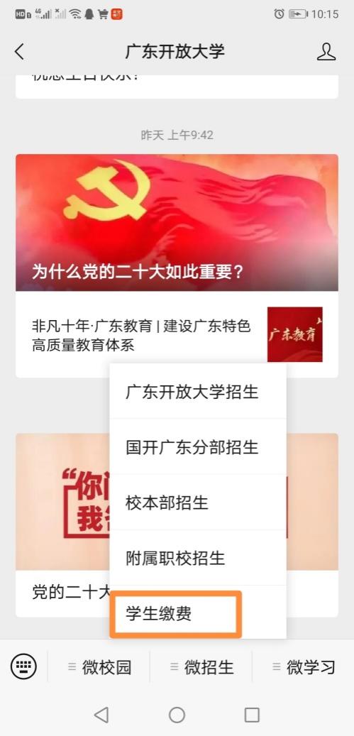 學(xué)生關(guān)注學(xué)校微信公眾號“廣東開放大學(xué)”--→“微招生”--→“學(xué)生繳費(fèi)”