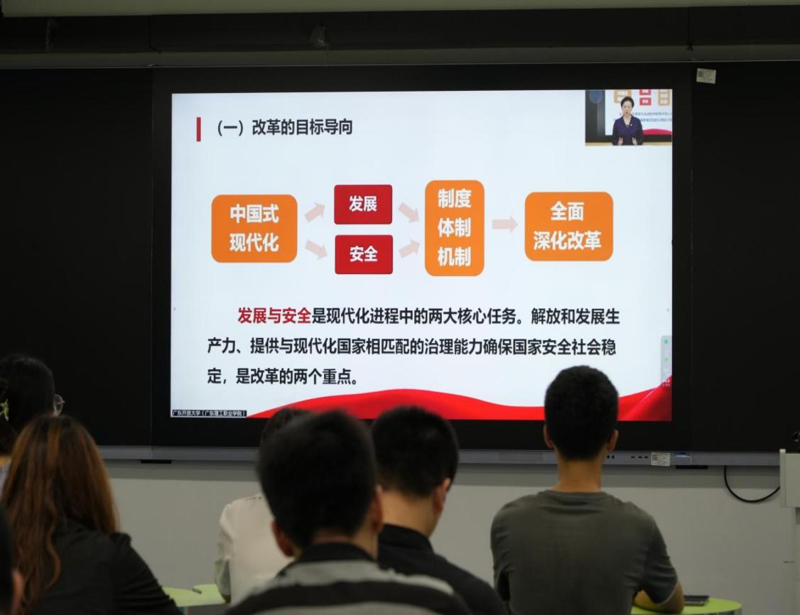 2024年9月5日下午,廣東開放大學(xué)黨委副書記、校長劉文清以“擘畫新時代改革開放新藍(lán)圖——學(xué)習(xí)貫徹黨的二十屆三中全會精神”為主題,通過網(wǎng)絡(luò)直播面向全省開大體系師生講“思政第一課”。華立分校通過微信、QQ等方式通知全體學(xué)生收看,同時組織部分師生在西三教學(xué)樓211課室集中觀看和學(xué)習(xí)交流。