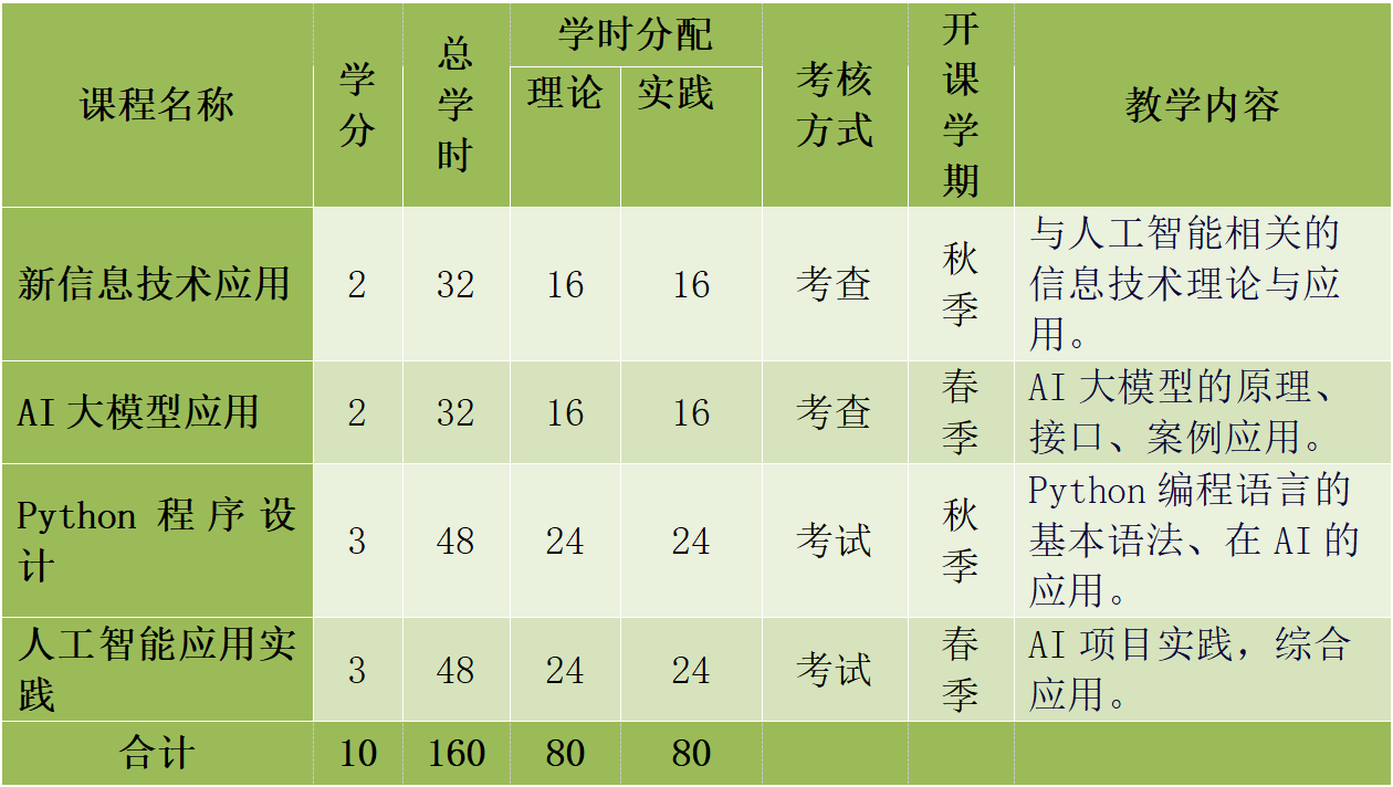 本專業(yè)致力于培養(yǎng)具備堅(jiān)實(shí)的人工智能基礎(chǔ)理論知識(shí)、計(jì)算思維能力,以及良好的實(shí)踐能力的高素質(zhì)復(fù)合型人才。學(xué)生將掌握人工智能的基本應(yīng)用理論和專業(yè)知識(shí),具備算法實(shí)現(xiàn)能力和應(yīng)用場(chǎng)景分析能力,能夠綜合使用AI大模型工具解決生活和工作中的基本問(wèn)題??既∪斯ぶ悄芟嚓P(guān)技能證書。