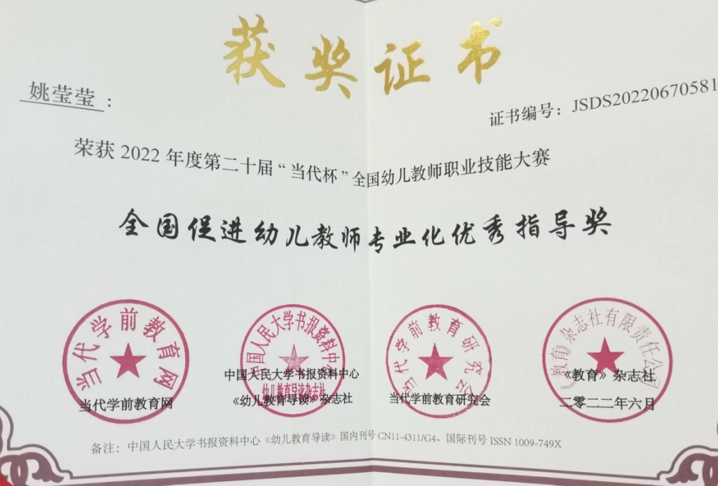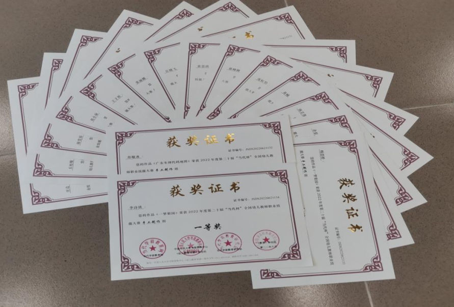 本次大賽主題為“創(chuàng)新,源于對教育的感悟”,旨在挖掘教師在教案、說課稿、活動(dòng)計(jì)劃、觀察記錄、教育隨筆、案例分析、論文、環(huán)境創(chuàng)設(shè)、手工制作、玩教具制作、課件PPT、故事講述、繪畫、兒歌彈唱、舞蹈等方面的作品積累與創(chuàng)意才能。以賽促教、以賽促學(xué)、以賽促改、以賽促建。結(jié)合學(xué)校學(xué)前教育人才培養(yǎng)方案,學(xué)校領(lǐng)導(dǎo)高度重視本次大賽,確立了以院長為領(lǐng)隊(duì)、學(xué)前骨干教師為指導(dǎo)、教學(xué)秘書統(tǒng)籌協(xié)調(diào)、學(xué)生廣泛報(bào)名參賽的工作實(shí)施方案。強(qiáng)調(diào)以此次大賽為契機(jī),以育人強(qiáng)能為重點(diǎn),不斷強(qiáng)化學(xué)生“崗課賽證”相融通的專業(yè)技術(shù)技能訓(xùn)練。經(jīng)過三個(gè)月的艱苦訓(xùn)練和精心打磨,作品《一夢梨園》、《廣東車牌代碼地圖》榮獲一等獎(jiǎng),作品《北京冬奧2022》、《藍(lán)鯨》、《疫情后的春天》、《動(dòng)物園》、《大班科學(xué)活動(dòng)我愛吹泡泡》、《粉刷匠》、《森系小屋》榮獲二等獎(jiǎng)的;作品《幼兒防溺水》、《致敬大白》、《飛天逐夢》、《小豬減肥記》、《賣報(bào)歌》、《五彩公雞打鳴》、《狼和小羊》;優(yōu)秀獎(jiǎng)《烏云笑了》、《好媽媽》、《小熊不刷牙》榮獲三等獎(jiǎng),姚瑩瑩老師獲得全國促進(jìn)幼兒教師專業(yè)化優(yōu)秀指導(dǎo)獎(jiǎng)。碩果累累!此次大賽實(shí)現(xiàn)了學(xué)生自我設(shè)計(jì)、自我創(chuàng)新和自我提升的參賽體驗(yàn)及目標(biāo)。