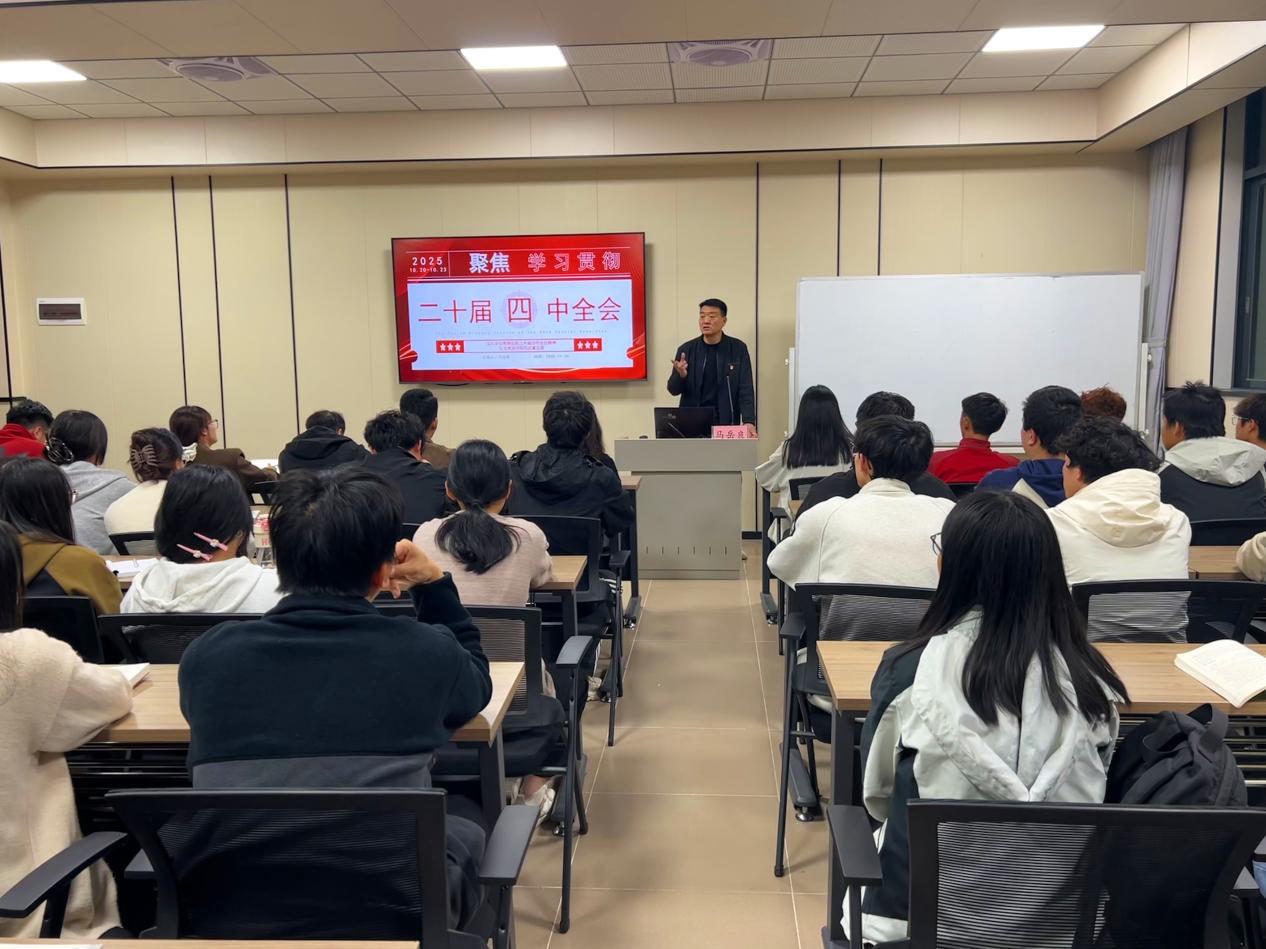 為深入學(xué)習(xí)貫徹黨的二十屆四中全會精神,引導(dǎo)全院師生將思想和行動統(tǒng)一到黨中央決策部署上來,11月26日晚,教育學(xué)院黨總支書記、院長馬岳良以“深入學(xué)習(xí)貫徹黨的二十屆四中全會精神,扎實推進學(xué)院高質(zhì)量發(fā)展”為主題,為學(xué)院入黨積極分子、學(xué)生骨干代表及全體教師開展專題宣講會,推動全會精神在校園落地生根。