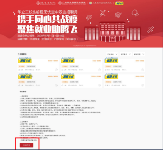 進(jìn)入頁(yè)面后,大家可以看到這次的線(xiàn)上雙選會(huì)對(duì)學(xué)校及學(xué)生身份劃分得比較細(xì)致,同學(xué)們可以依據(jù)自身的情況選擇相應(yīng)的專(zhuān)區(qū)進(jìn)行崗位搜索。