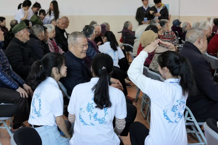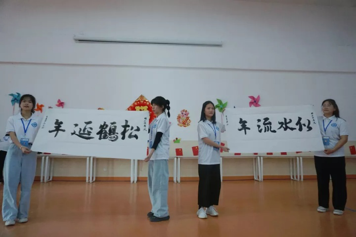 到達(dá)敬老院后由實踐部干部帶領(lǐng)學(xué)生會干事排隊進(jìn)入敬老院活動室,干事們陪老人們聊天逗樂,為老人們帶來了舞蹈《美美噠》、歌曲《外婆的澎湖灣》《那些年你很冒險的夢》、手語操《國家》,以及學(xué)生會外聯(lián)部部長為老人們送上書法“松鶴延年,似水流年”的祝福,最后所有干事以一首《千山萬水》結(jié)束了此次敬老院文藝匯演。