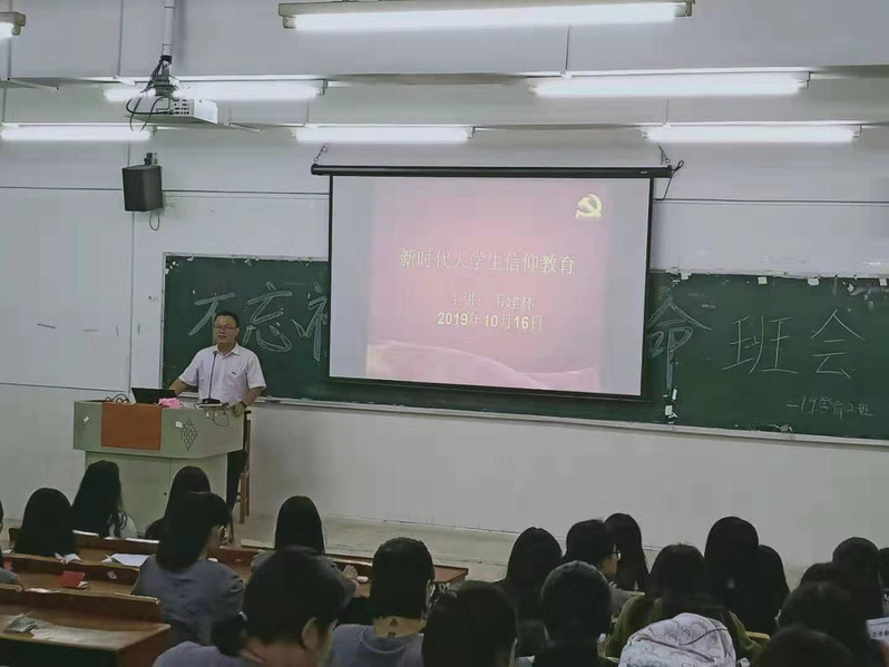 為進一步加強對一九級同學的思想教育,提高一九級政治信仰與加入黨組織方面的積極性。二零一九年十月十六日,在一九級同學晚修期間,第一黨支部書記韋建林老師在圖書館三零一對一九級同學進行名為“新時代大學生信仰”的主題教育。