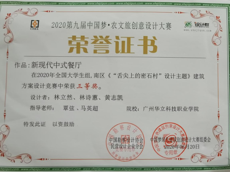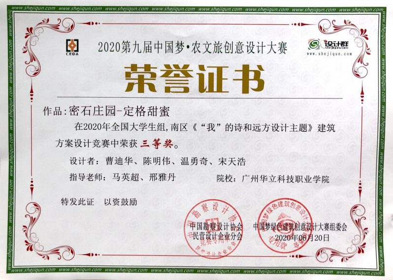 在學(xué)院邢雅丹、鄭志強(qiáng)老師帶領(lǐng)下,學(xué)院馬英超、覃弦老師積極帶隊(duì)參加南區(qū)賽事“都市生活平衡器”獅頭嶺果園設(shè)施改造設(shè)計(jì)。通過專家提名、點(diǎn)評及評優(yōu)等多階段選拔,經(jīng)過大家不懈的努力和激烈的競爭,我院學(xué)生曹迪華、溫勇奇、宋天浩、陳明偉在“我的詩和遠(yuǎn)方”主題設(shè)計(jì)中,作品《密石莊園-定格甜蜜》榮獲三等獎;林立然、黃志凱、林詩惠組在“舌尖上的密石村”主題設(shè)計(jì)中,作品《新現(xiàn)代中式餐廳》榮獲三等獎。