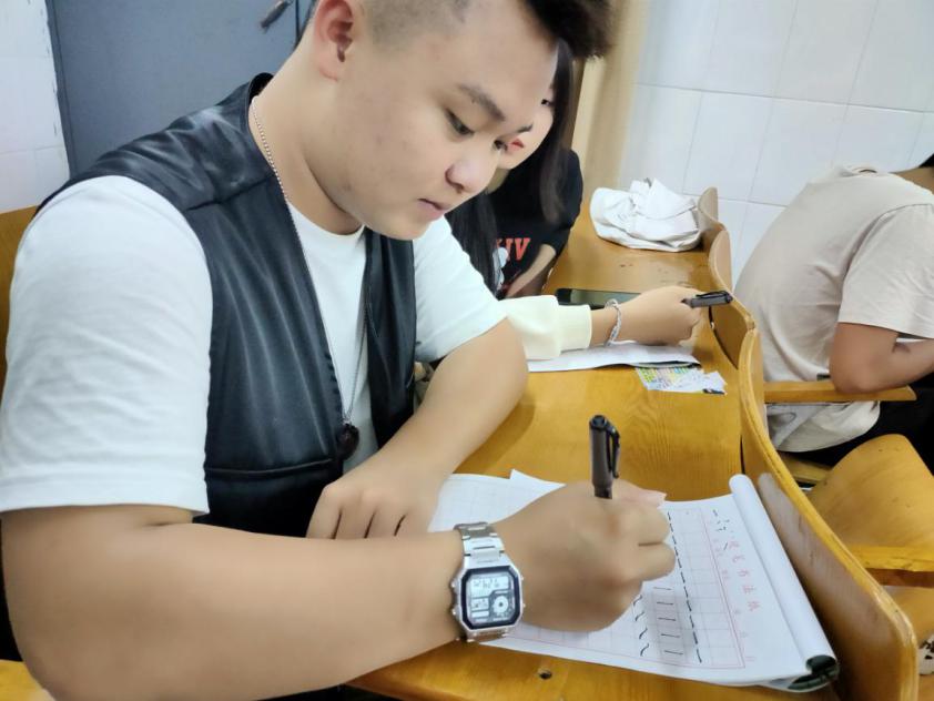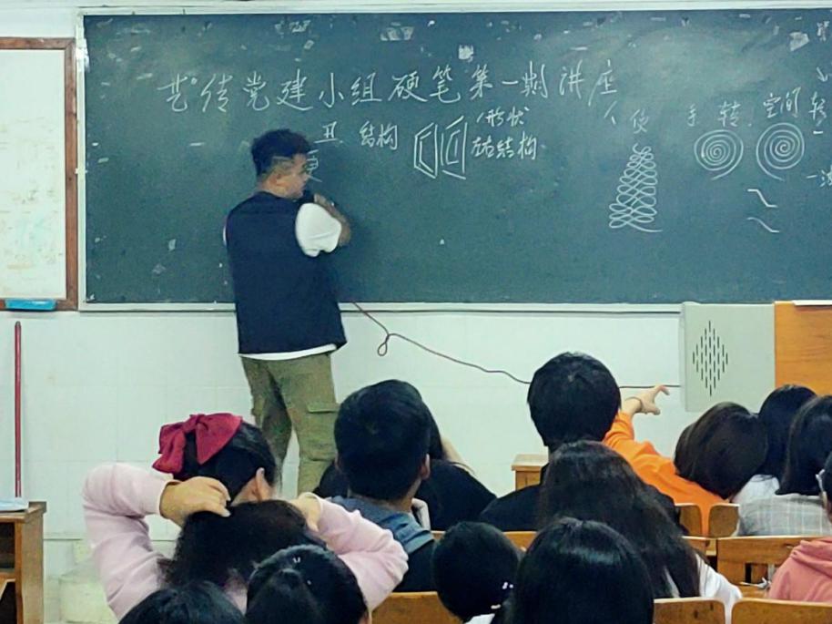 講座開始由張召能隊(duì)長教同學(xué)們基本筆畫,在黑板上親自示范詳細(xì)講述一個筆畫的開頭到結(jié)尾。想要練好書法,筆畫的書寫十分重要,除此之外對于控筆的要求也非常高。同學(xué)們在進(jìn)行球類運(yùn)動時會練出手臂的肌肉,這并不利于書法中的“軟”的展現(xiàn),但是隊(duì)長有妙招!通過練習(xí)畫類似于蚊香的曲線可以有效改善肌肉過硬的問題,從而達(dá)到更好的效果。字體的整體呈現(xiàn)還需要形狀、方向、大小的配合,這幾點(diǎn)缺一不可。