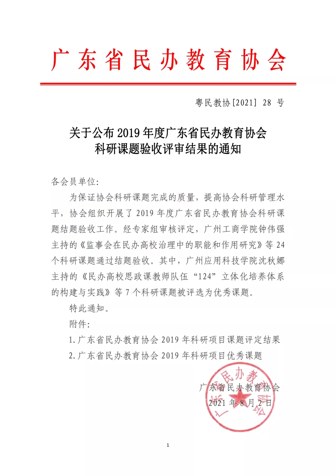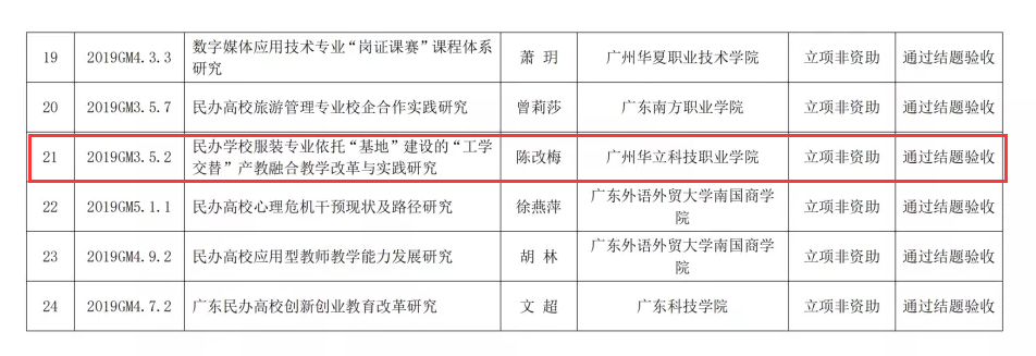 根據(jù)《廣東省民辦教育協(xié)會關于開展2019年度科研項目結題驗收工作的通知》(粵民教協(xié)〔2019〕6號),廣東省民辦教育協(xié)會組織專家開展了結題驗收工作,經專家組審核評定,我院陳改梅老師的課題《民辦學校服裝專業(yè)依托“基地”建設的“工學交替”產教融合教學改革與實踐研究》(課題編號:2019GM3.5.2)順利通過驗收,課題被評選為廣東省民辦教育協(xié)會省級優(yōu)秀課題。