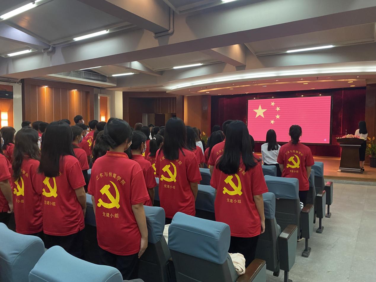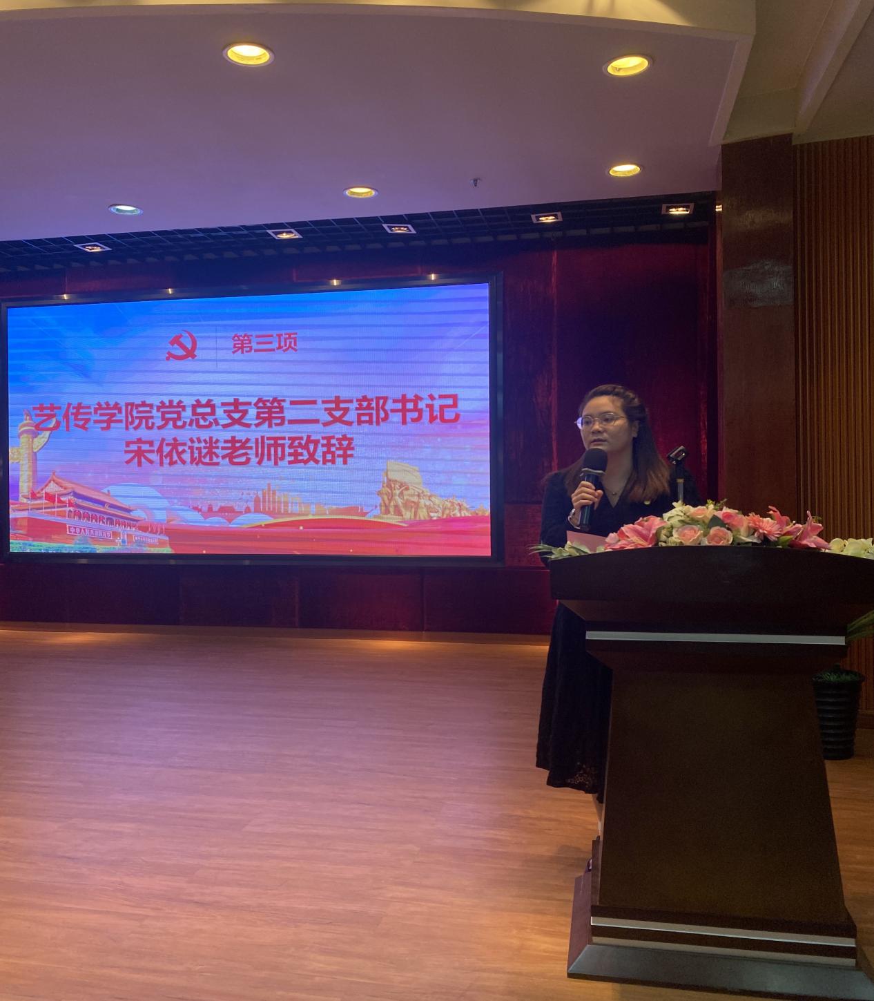 國歌奏唱完畢,藝傳學院黨總支第二黨支部書記宋依謎老師上臺致詞。她強調(diào),人的一生要有這么一個信仰,黨的方針、黨的思想我們要去追,習近平總書記所講到的每一個字眼每一句話我們都要認真去學習,包括在未來的日子里在座的各位都要學會如何去學習!希望同學們能在工作中承擔起一份責任,將黨建工作做得更好,成為藝傳學院的一道風景。