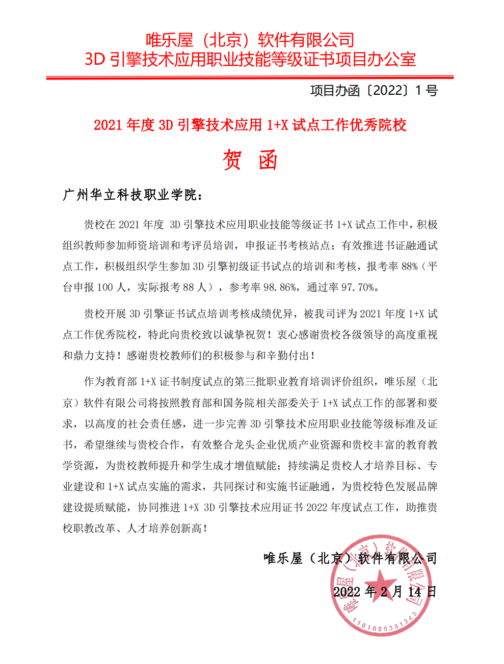 根據(jù)教育部、國(guó)務(wù)院相關(guān)部委和省教育廳關(guān)于1+X試點(diǎn)工作部署要求,在學(xué)校的領(lǐng)導(dǎo)下,我院在2021年度1+X 3D引擎技術(shù)應(yīng)用職業(yè)技能等級(jí)證書試點(diǎn)建設(shè)工作中,積極組織師資培訓(xùn)和考評(píng)員培訓(xùn),申報(bào)證書考核站點(diǎn)建設(shè),有效推進(jìn)書證融通試點(diǎn)工作,組織學(xué)生參加3D引擎技術(shù)初級(jí)證書試點(diǎn)的培訓(xùn)和考核。在2021年度1+X 3D引擎技術(shù)應(yīng)用初級(jí)技能等級(jí)證書的考核中成績(jī)優(yōu)異,參加考試通過率為97.70%,得到教育部證書考核評(píng)價(jià)組織高度認(rèn)可,獲評(píng)為2021年度3D引擎技術(shù)應(yīng)用1+X 試點(diǎn)工作優(yōu)秀院校。