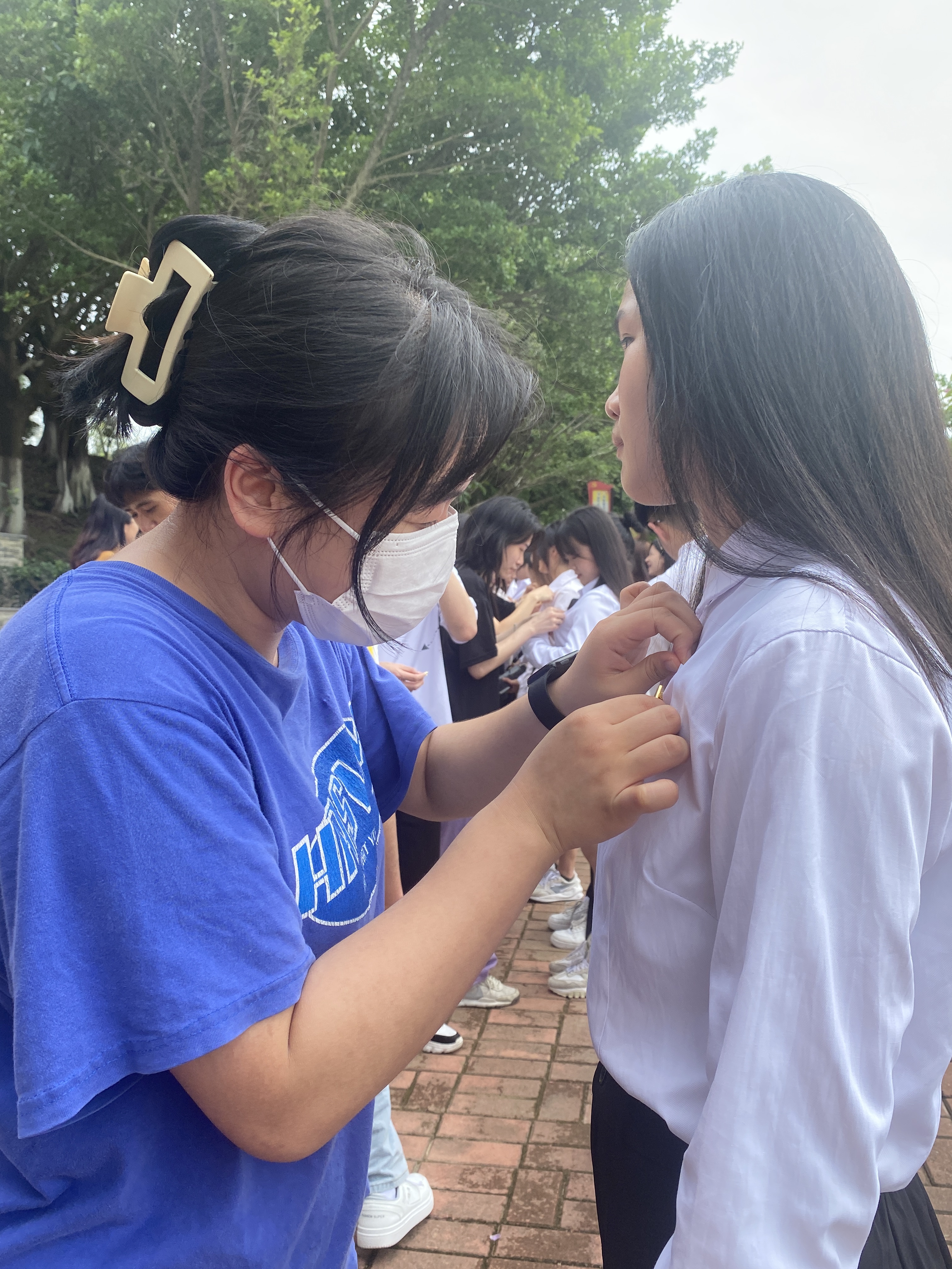 接下來,進(jìn)行入黨宣誓儀式和佩戴黨徽。由宋依謎同志領(lǐng)誓,全體學(xué)生黨員舉起右手面對(duì)黨旗莊嚴(yán)宣誓。宣誓結(jié)束,老黨員為新黨員佩戴黨徽,叮囑新黨員牢記入黨宣誓,不忘使命,時(shí)刻以共產(chǎn)黨員的標(biāo)準(zhǔn)嚴(yán)格要求自己。