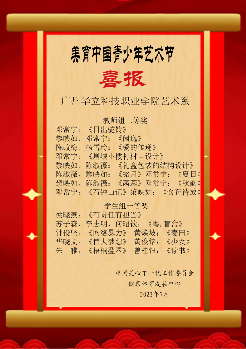 由中國關(guān)心下一代工作委員會(huì)舉辦的全國“美育青少年藝術(shù)節(jié)高校作品大賽”比賽活動(dòng)中,我院師生獲得優(yōu)異成績。在本次大賽活動(dòng)中,我院陳改梅、鄧常寧、李桂林、黎映如、姜兵、陳舒薇老師獲得優(yōu)秀指導(dǎo)老師獎(jiǎng),鄧常寧老師獲得優(yōu)秀組織獎(jiǎng)。以上老師分別榮獲教師組一、二等獎(jiǎng),我院有25名學(xué)生獲得優(yōu)異成績。
