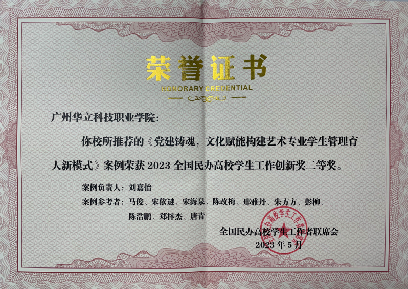 在本屆研討會(huì)中,我校學(xué)工團(tuán)隊(duì)研究成果豐碩,獲得多項(xiàng)榮譽(yù),其中我院學(xué)管負(fù)責(zé)人劉嘉怡老師主持的案例《黨建鑄魂,文化賦能構(gòu)建藝術(shù)專業(yè)學(xué)生管理育人新模式》榮獲2023全國(guó)民辦高校學(xué)生工作創(chuàng)新獎(jiǎng)二等獎(jiǎng)。
