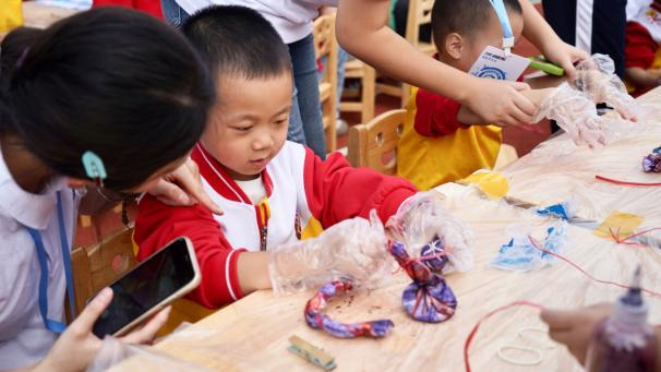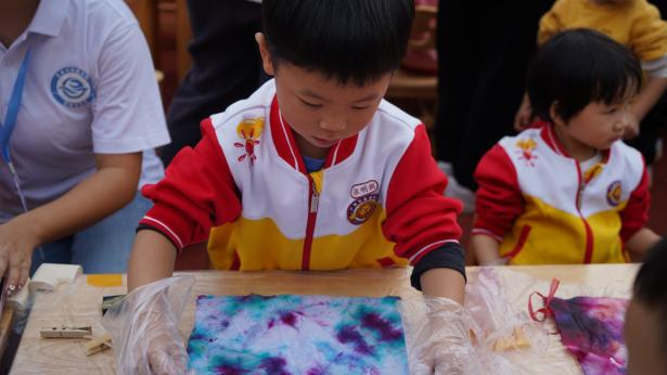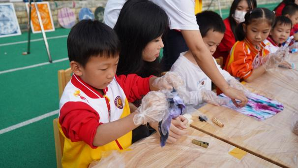 活動中,藝術與傳媒學院黨總支書記陳改梅老師結合紅色故事,為孩子們講述植物染的歷史與意義,以非遺文化和扎染技藝為載體,帶領大家探索扎染技法在植物染中的奧秘。孩子們與非遺項目“零距離”接觸,親自動手感受非遺技藝的精巧,體會非遺文化的精神,孩子們認真地傾聽著,在欣賞、操作中感受著傳統(tǒng)文化的藝術魅力,大大提高審美能力和動手能力。