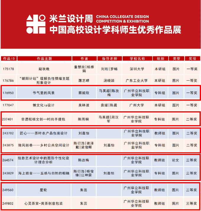 近日,由中國高等教育學會、中國教育國際交流協(xié)會主辦的“第八屆米蘭設計周-中國高校設計學科師生優(yōu)秀作品展”廣東賽區(qū)評選圓滿落幕。我校藝術與傳媒學院師生榮獲一等獎1項,二等獎3項,三等獎4項。(一、二等獎作品晉級國賽)