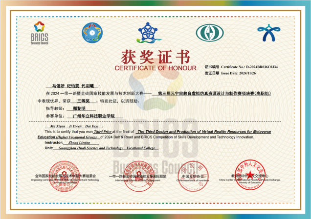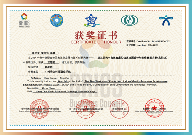 2024年11月15-17日,2024“一帶一路暨金磚國家技能發(fā)展與技術(shù)創(chuàng)新大賽·第三屆元宇宙教育虛擬仿真資源設(shè)計與制作”賽項全國決賽在廣州舉行,來自全國16個省、自治區(qū)、直轄市及新疆生產(chǎn)建設(shè)兵團(tuán)的77所學(xué)校的101支師生隊伍參加比賽,藝術(shù)與傳媒學(xué)院動漫制作技術(shù)系主任鄭黎明老師指導(dǎo)的兩支參賽隊(李衛(wèi)東,梁祖強(qiáng),高晴;馬僖妍,紀(jì)怡雯,代羽曦)在為期三天的比賽中脫穎而出,獲得2項銅獎。