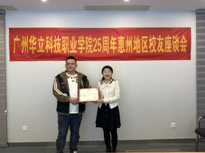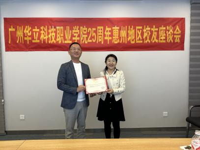 2024年12月28日,廣州華立科技職業(yè)學(xué)院成立25周年之際,為充分發(fā)揮校友智慧,凝聚校友力量,在惠州市惠城區(qū)惠鵬大廈召開校友座談會并成立惠州分會成立大會。參加此次座談會的有藝術(shù)與傳媒學(xué)院黨總支書記陳改梅、就業(yè)主任黎映如、學(xué)管主任劉嘉怡、骨干教師吳玉嫻和謝瑞祥,以及惠州地區(qū)部分校友。
