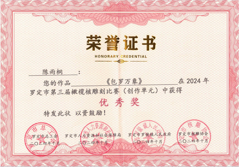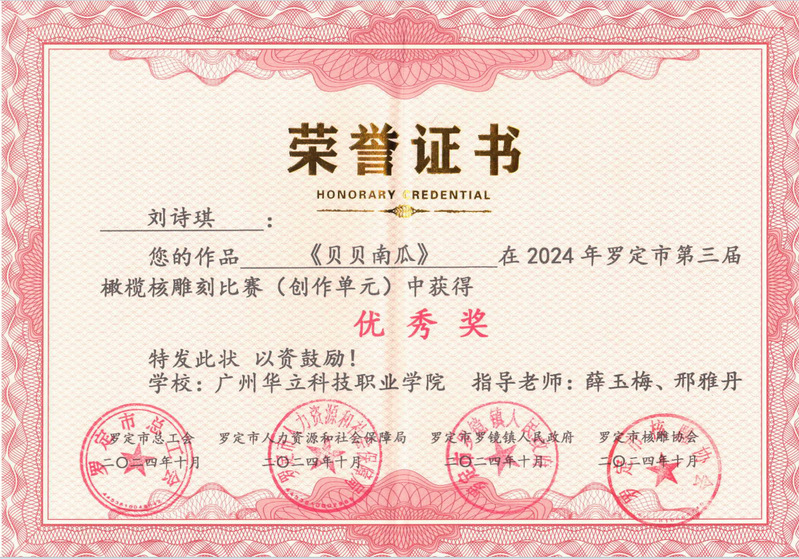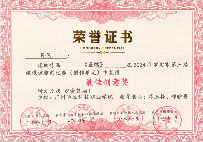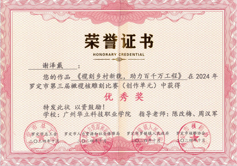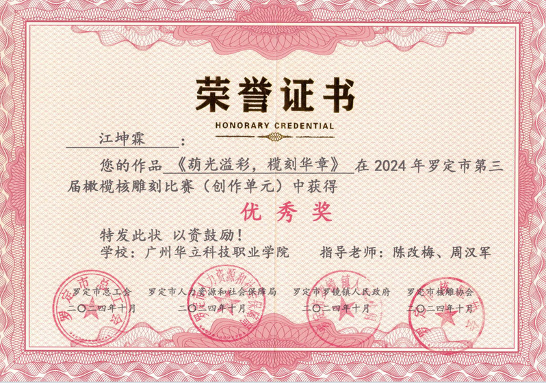 微雕世界,大美云浮,由云浮市人力資源和社會(huì)保障局、羅定市總工會(huì)、羅定市人力資源和社會(huì)保障局、羅定市羅鏡鎮(zhèn)人民政府主辦。力在深入貫徹落實(shí)黨中央關(guān)于實(shí)施鄉(xiāng)村振興戰(zhàn)略的決策部署,及全面推動(dòng)省委省政府“百縣千鎮(zhèn)萬(wàn)村高質(zhì)量發(fā)展工程”走深走實(shí)。本次大賽分橄欖核雕精修、橄欖核雕創(chuàng)作兩個(gè)單元,我校師生積極參賽,并根據(jù)比賽大綱認(rèn)真?zhèn)滟悾?jīng)過(guò)一個(gè)多月的激烈角逐,在專家評(píng)委對(duì)作品藝術(shù)特色、工藝手法技巧、藝術(shù)創(chuàng)意水平、形象空間美感等多方位的嚴(yán)格評(píng)選及網(wǎng)絡(luò)投票綜合評(píng)比下,我校師生在此次比賽中榮獲三等獎(jiǎng)1項(xiàng)、最佳創(chuàng)意獎(jiǎng)1項(xiàng)以及優(yōu)秀獎(jiǎng)6項(xiàng)的優(yōu)異成績(jī)。這不僅是對(duì)師生精湛技藝的肯定,更是對(duì)我校在美育藝術(shù)教學(xué)和研究方面所取得成果的認(rèn)可。