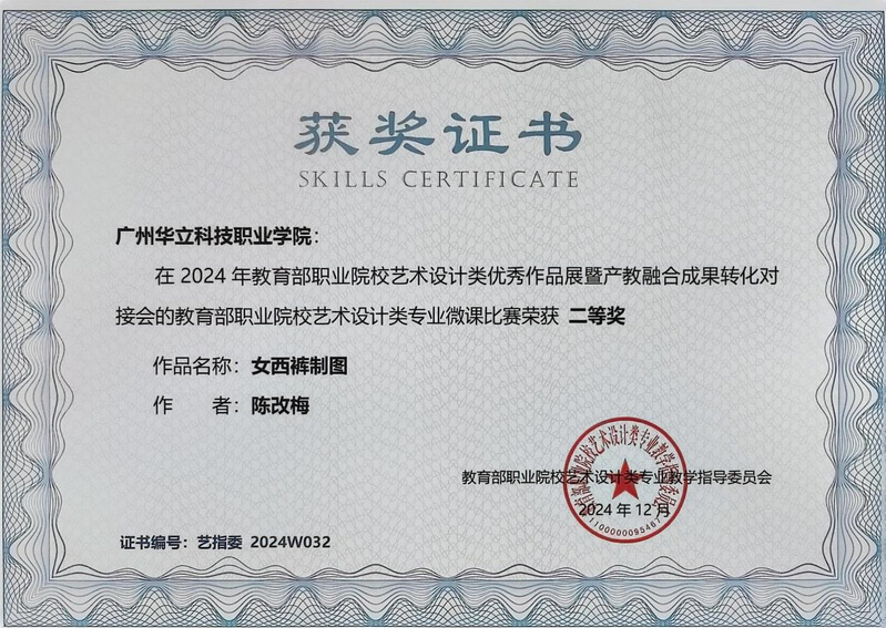 2024年12月13日-15日,由教育部職業(yè)院校藝術設計類專業(yè)教學指導委員會主辦的“職業(yè)院校藝術設計類優(yōu)秀作品展暨 2024年產(chǎn)教融合成果轉(zhuǎn)化對接會”在廣州琶洲靈感創(chuàng)新展館盛大舉行。在本次對接會的教育部職業(yè)院校藝術設計類專業(yè)微課比賽中,廣州華立科技職業(yè)學院藝術與傳媒學院陳改梅老師憑借作品《女西褲制圖》脫穎而出,榮獲國賽二等獎。