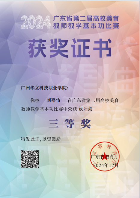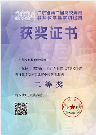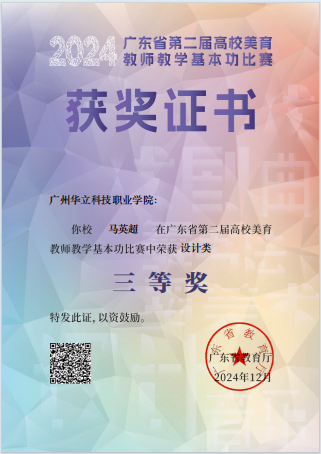廣東省第二屆高校美育教師教學(xué)基本功決賽比賽在廣東省技術(shù)師范學(xué)院成功舉辦,來(lái)自全省各高校的美育教師們齊聚一堂,展開(kāi)了一場(chǎng)精彩紛呈的教學(xué)技藝大比拼。經(jīng)過(guò)與眾多優(yōu)秀選手激烈角逐和專家評(píng)委們的嚴(yán)格評(píng)審,經(jīng)過(guò)“專業(yè)技能展示”、“教學(xué)技能展示”和“審美與人文素養(yǎng)展示”三重考驗(yàn)后,我院陳舒薇老師憑借其豐富的專業(yè)的實(shí)踐經(jīng)驗(yàn)及其深入淺出的教學(xué)設(shè)計(jì)、生動(dòng)活潑的課堂講解還有對(duì)美育獨(dú)特的見(jiàn)解,最終榮獲設(shè)計(jì)類二等獎(jiǎng)。