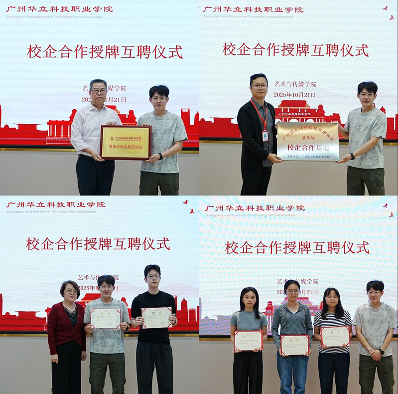 為深化產(chǎn)教融合,拓寬學(xué)生就業(yè)創(chuàng)業(yè)視野,2025年10月21日下午,廣州華立科技職業(yè)學(xué)院藝術(shù)與傳媒學(xué)院與廣州冠岳網(wǎng)絡(luò)科技有限公司在學(xué)校圖書館104隆重舉行了“數(shù)藝世界”校企合作簽約授牌互聘儀式暨就業(yè)創(chuàng)業(yè)經(jīng)驗(yàn)分享會(huì)。本次活動(dòng)得到了校企雙方的高度重視。學(xué)校副校長陳顯強(qiáng)、教務(wù)處處長孫麗英、實(shí)踐教學(xué)科科長韋建林,藝術(shù)與傳媒學(xué)院院長朱君、黨總支書記陳改梅等領(lǐng)導(dǎo)老師出席活動(dòng)。廣州冠岳網(wǎng)絡(luò)科技有限公司謝增福經(jīng)理、黃龍城項(xiàng)目總監(jiān)作為企業(yè)方代表參會(huì)。