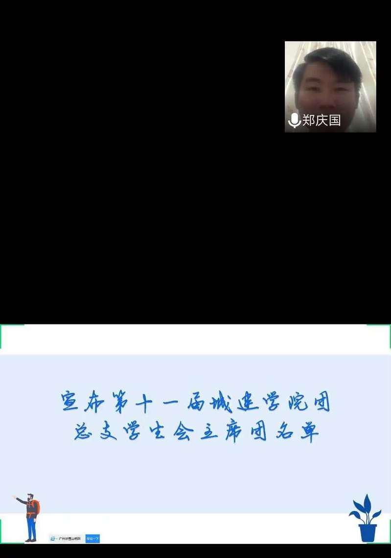 廣州華立科技職業(yè)學(xué)院城建學(xué)院團總支學(xué)生會第十一屆主席團第三輪競選于2020年6月6日晚上7點30分通過騰訊視頻會議線上舉行。出席本次競選大會的領(lǐng)導(dǎo)嘉賓有:城建學(xué)院辦公室主任劉軍根老師、城建學(xué)院學(xué)管主任林輝文老師、校團委副書記楊濤老師、國際經(jīng)濟與外語學(xué)院團總支書記陳權(quán)豐老師、管理學(xué)院團總支書記陳媛老師、藝術(shù)與傳媒學(xué)院團總支書記鄭梓杰老師、計算機信息工程學(xué)院團總支書記郭麗純老師、會計學(xué)院團總支書記陳美欣老師、城建學(xué)院團總支書記鄭慶國老師、城建學(xué)院18級輔導(dǎo)員廖佩宇老師、城建學(xué)院19級輔導(dǎo)員朱志豪老師、城建學(xué)院19級實習(xí)輔導(dǎo)員曾劍松老師、城建學(xué)院19級實習(xí)輔導(dǎo)員莊勇輝老師、城建學(xué)院辦公室實習(xí)生詹科老師、第九屆團總支學(xué)生會主席團師兄師姐、第十屆團總支學(xué)生會主席團全體成員、以及各部門代表。