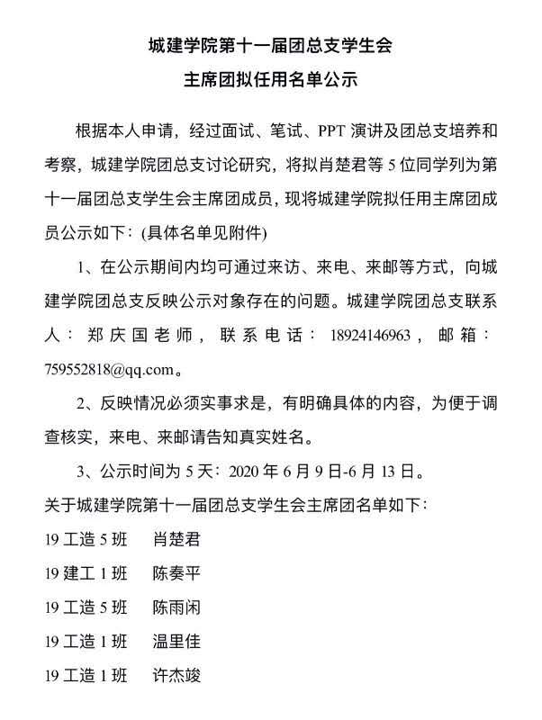 各位嘉賓們和各部門代表在問星卷線上投票,由主席團負責檢票,在公正、公平、公開的前提下,學(xué)生會主席團最終名單已有結(jié)果。第十一屆團總支學(xué)生會主席團的最終名單由城建學(xué)院團總支書記鄭慶國老師宣布:由肖楚君、陳奏平,溫里佳,陳雨閑,許杰竣五名候選人擬任城建學(xué)院第十一屆團總支學(xué)生會主席團成員,并在學(xué)院公示五日。