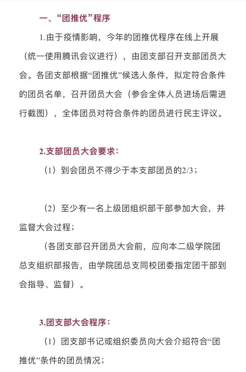為貫徹中央關(guān)于新冠病毒感染的肺炎疫情防控的總體要求,全校師生實行停課不停學(xué)政策。線上發(fā)展中國共產(chǎn)主義青年團是中國共產(chǎn)黨的助手和后備軍,推薦優(yōu)秀團員作為黨的培養(yǎng)對象工作(以下簡稱“團推優(yōu)”),是黨賦予共青團組織的一項光榮任務(wù),也是充分發(fā)揮共青團作為黨的助手和后備軍作用的重要措施。