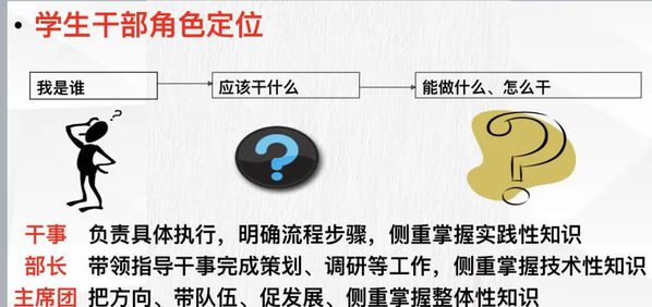 鄭慶國老師先提出要明確作為一名學(xué)生干部的角色定位。其次,強(qiáng)調(diào)了作為學(xué)生干部應(yīng)具備的“五點(diǎn)”能力。 接著,鄭慶國老師詳細(xì)解釋學(xué)生干部應(yīng)具備的“五點(diǎn)”能力。最后,鄭慶國老師對學(xué)生會(huì)工作應(yīng)保持了什么樣的態(tài)度提出了一些建議。