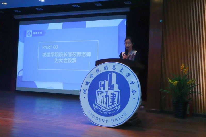 奏唱團歌后是由城建學院院長鄒筱萍老師為大會致辭,對過往成績的回顧,你對新一屆學生會實習生提出三點要求:1.要牢記學生會的宗旨,本著“全心全意為同學服務的意識2.每位實習生都要樹立“以服務為本的宗旨3.堅持自我管理、自我教育、自我服務的三自教育。