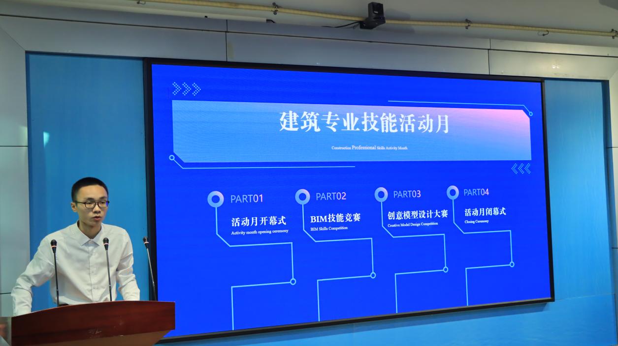 接著由本次活動月策劃人建筑工程技術(shù)專業(yè)楊燦濤(校建筑協(xié)會)同學(xué)介紹了活動的安排,包括開幕式、BIM技能競賽、創(chuàng)意模型設(shè)計(jì)大賽和閉幕式四個(gè)環(huán)節(jié)的時(shí)間、活動形式和注意事項(xiàng),并為大家展示了學(xué)生的相關(guān)作品。