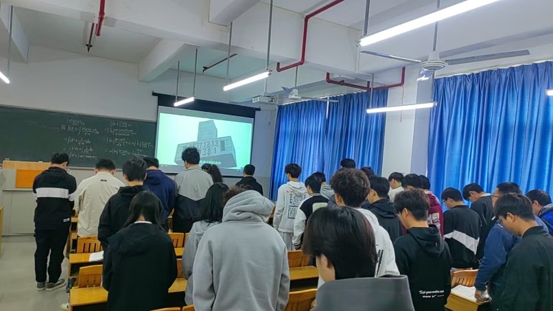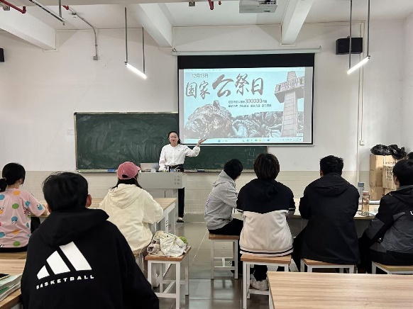 國行公祭,法立典章。鑄茲寶鼎,祀我國殤。教師黨支部書記劉昊茹給24級地礦專業(yè)學生講述抗日戰(zhàn)爭時期的英雄事跡、南京大屠殺的悲慘史實,以及新中國成立以來取得的輝煌成就,讓在場的每一位同學都深受觸動。教師黨支部組織統(tǒng)戰(zhàn)委員、輔導員楊嘉樺給23級建工專業(yè)學生召開主題班會,他表示,中國人只有發(fā)光發(fā)熱,砥礪前行努力振奮中華,民族復興才能守護那些“不能忘卻的記憶”,愿以吾輩之青春,捍衛(wèi)盛世之中華!羅遠明、馬芳、楊艷、鄭建勛、邵婷、陳思瑜、劉鋮聰?shù)冉處?,利用課堂三分鐘肅立默哀,緬懷革命先烈,悼念南京大屠殺中的無辜死難者以及為中國人民抗日戰(zhàn)爭勝利獻出生命的英雄。
