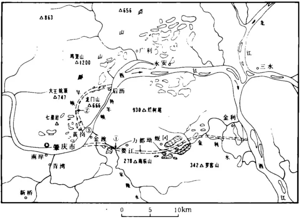 西江古河道與現(xiàn)河道圖(①——西江早期河道;②——西江中期河道;③——西江現(xiàn)河道)(吳繼遠(yuǎn),1993)