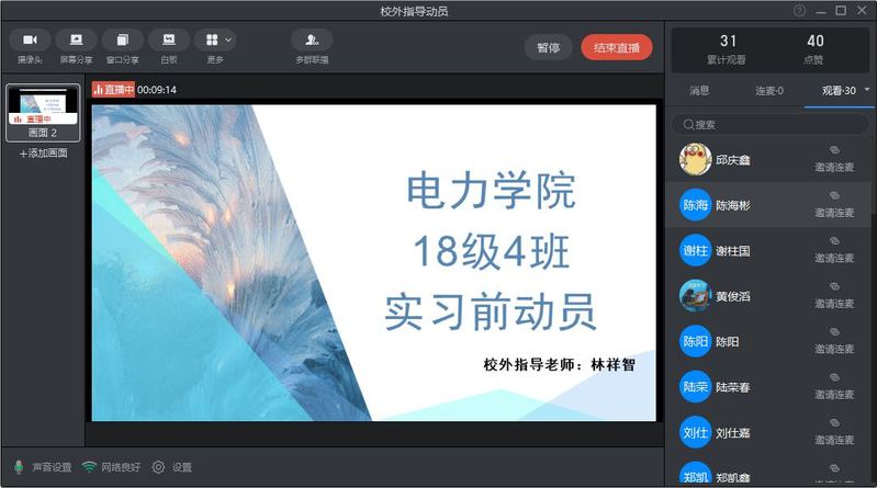 為進(jìn)一步做好2018級(jí)學(xué)生校外實(shí)習(xí)工作以及推進(jìn)我院校外教學(xué)工作順利開展。由于指導(dǎo)老師上網(wǎng)課的原因,不能統(tǒng)一時(shí)間,電力學(xué)院相關(guān)領(lǐng)導(dǎo)老師于2020年4月27日下午15:00和16:30分別兩場(chǎng)在企業(yè)微信視頻會(huì)議召開2018級(jí)校外教學(xué)指導(dǎo)老師實(shí)習(xí)動(dòng)員籌備會(huì)議。