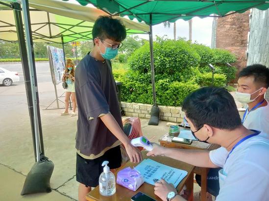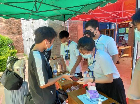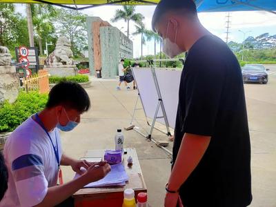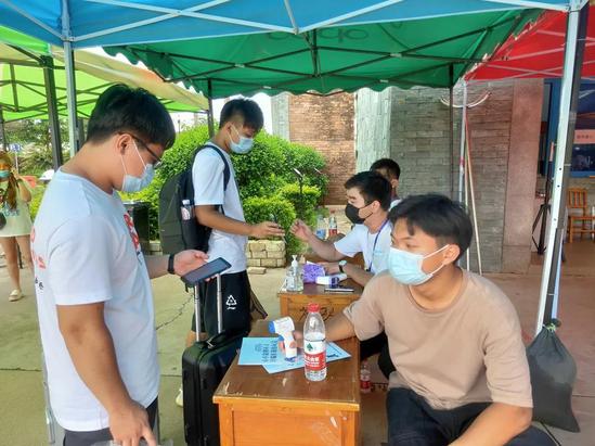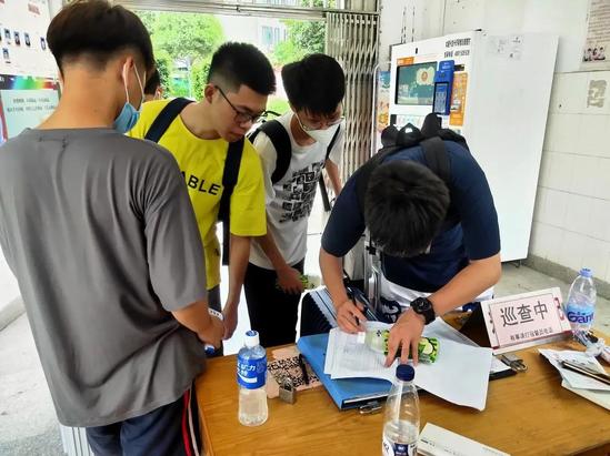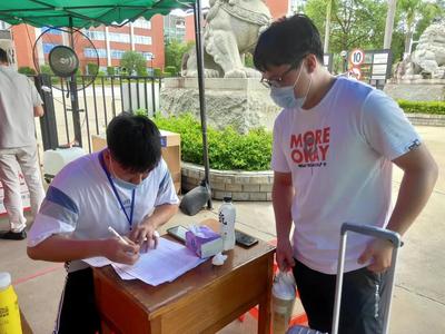 當天上午,學(xué)校的正大門早早搭起了帳篷,返校的學(xué)生入校需經(jīng)過各個關(guān)卡,通過檢測體溫、查驗葵花碼、查看移動軌跡,對行李和身體表面消毒,查驗學(xué)生身份和核對學(xué)生宿舍信息等多道程序,方能入校。