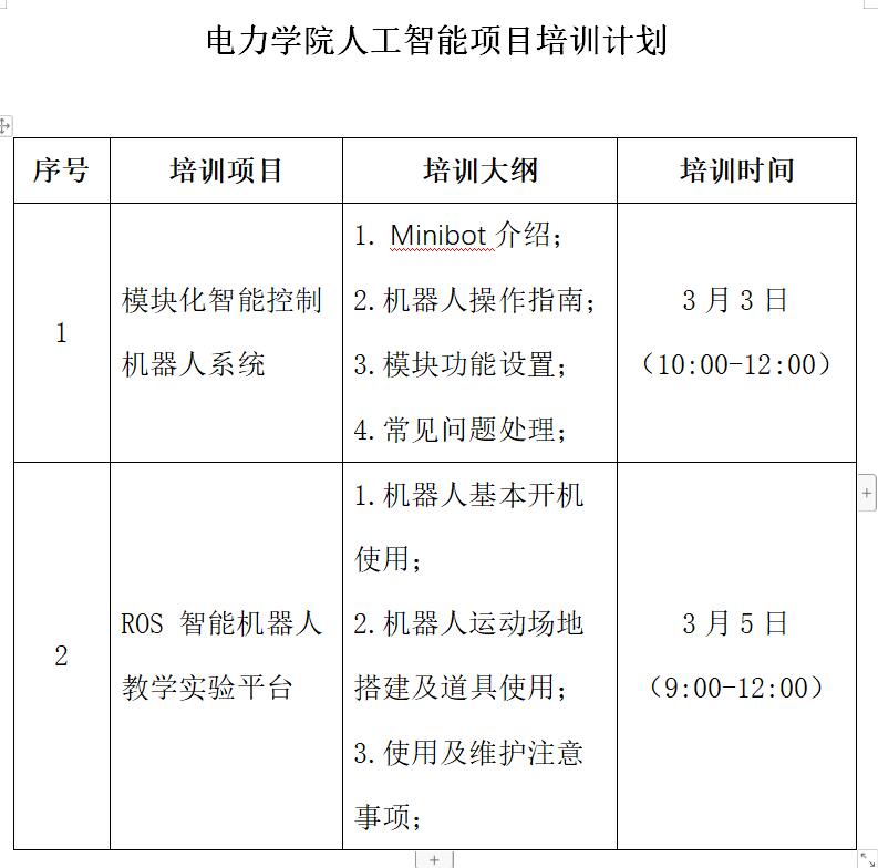 2021年3月3號上午、3月5號上午電力學(xué)院將組織設(shè)備供應(yīng)商在科技樓5樓進(jìn)行模塊化智能控制機(jī)器人系統(tǒng)、ROS 智能機(jī)器人教學(xué)實(shí)驗(yàn)平臺的設(shè)備培訓(xùn),請電力系、機(jī)械系老師按時(shí)參加,培訓(xùn)計(jì)劃見下表: