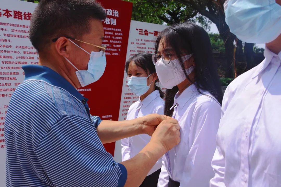 教師黨員給19級黨員佩戴黨徽