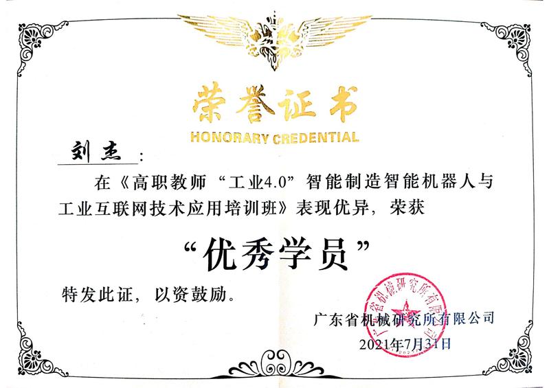 通過此次培訓(xùn),兩位教師對智能制造智能機器人和工業(yè)互聯(lián)網(wǎng)技術(shù)技能提升、把握職業(yè)教育方向,促進專業(yè)升級、課程開發(fā)、1+X證書等方面都有了一定的收獲,其中劉杰老師獲得“優(yōu)秀學(xué)員”,林祥智老師獲得“學(xué)習(xí)之星”。