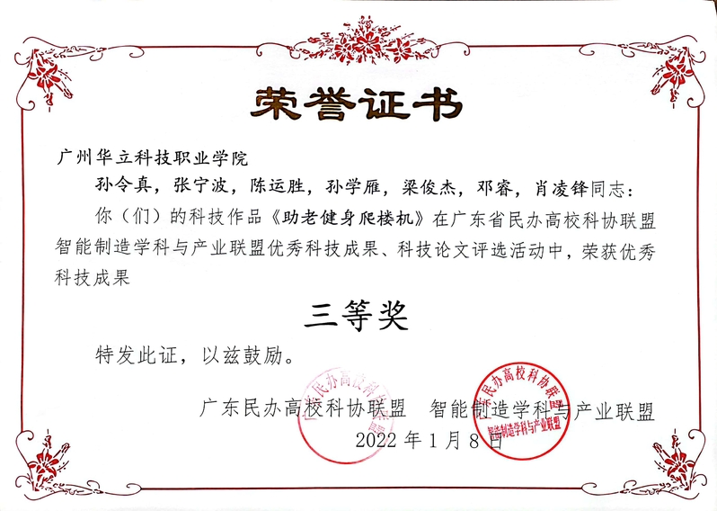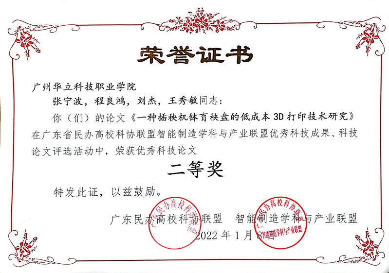 近日,廣東民辦高校科協(xié)聯(lián)盟與智能制造學科與產(chǎn)業(yè)聯(lián)盟公布了2021年優(yōu)秀科技成果、優(yōu)秀科技論文獲獎名單。我院提交的科技論文:《一種插秧機缽育秧盤的低成本3D打印技術研究》獲優(yōu)秀科技論文二等獎,科技成果:《助老健身爬樓機》、《減速帶》獲優(yōu)秀科技成果三等獎。