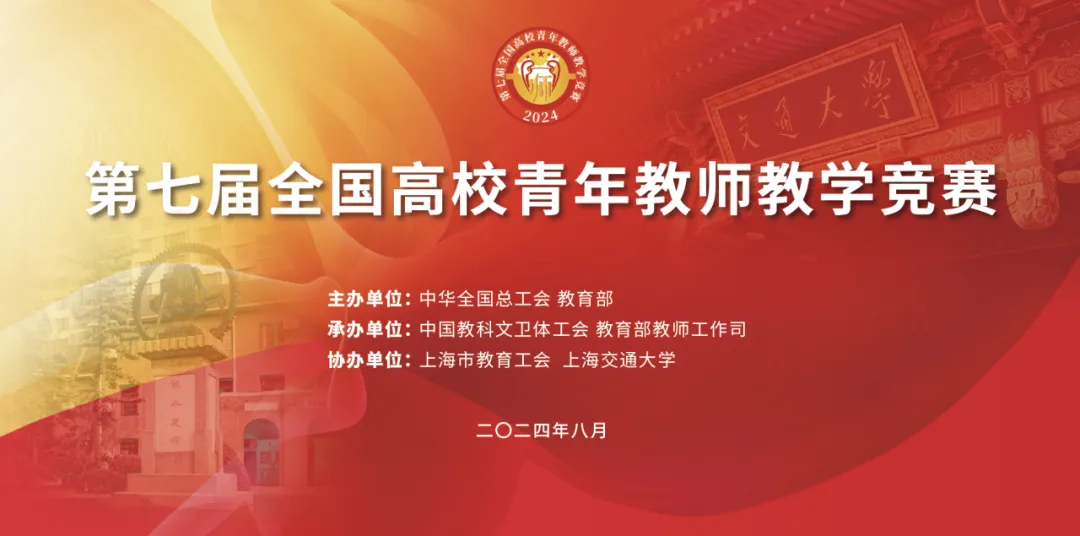 第七屆全國(guó)高校青年教師教學(xué)競(jìng)賽決賽于2024年8月26至30日在上海開(kāi)賽,本屆競(jìng)賽由中華全國(guó)總工會(huì)、教育部聯(lián)合主辦,中國(guó)教科文衛(wèi)體工會(huì)、教育部教師工作司承辦,上海市教育工會(huì)、上海交通大學(xué)協(xié)辦。